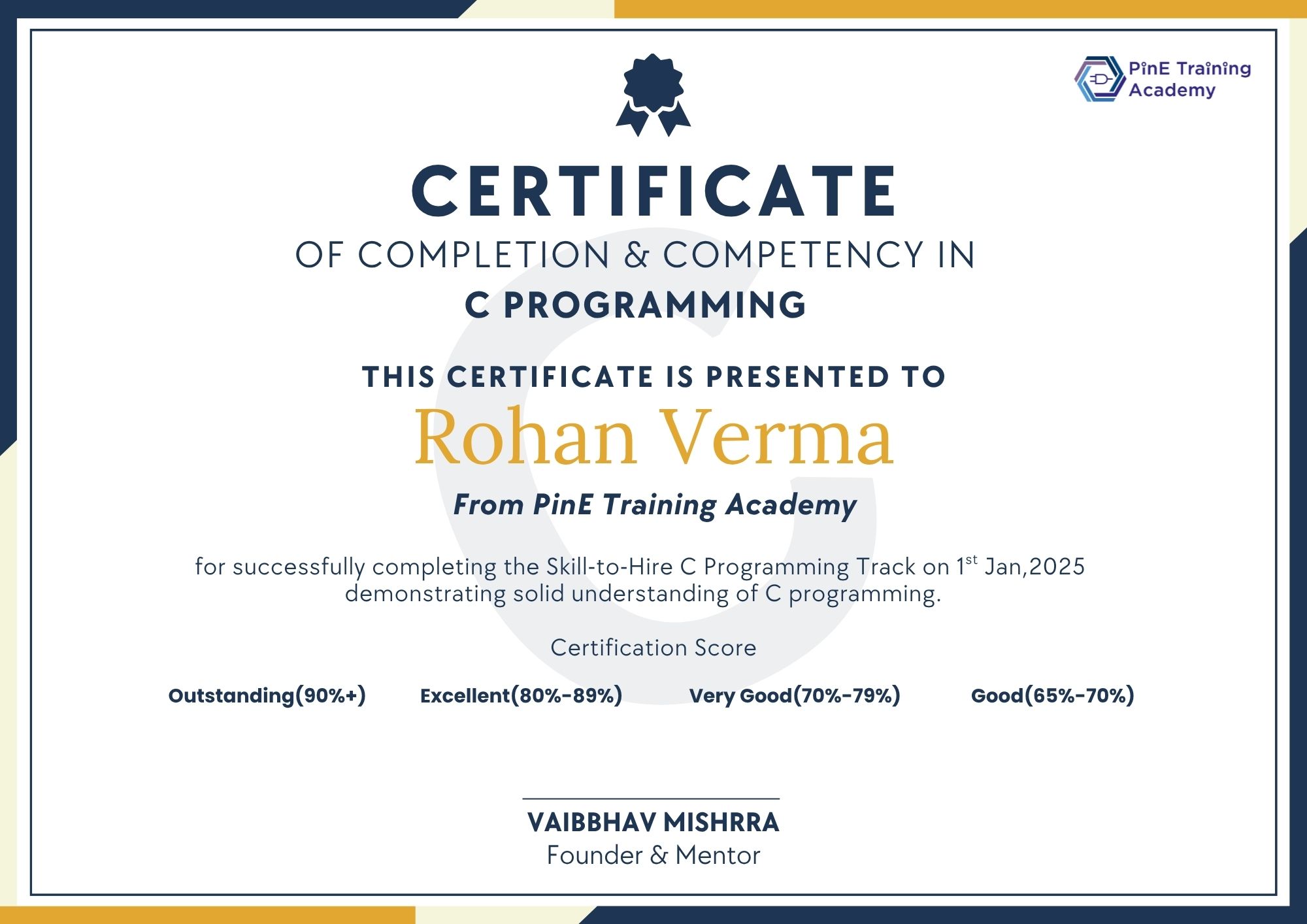 Students scoring 65% and above will receive an official C/C++ Developer Certification, recognizing their technical skills and mastery of the language.